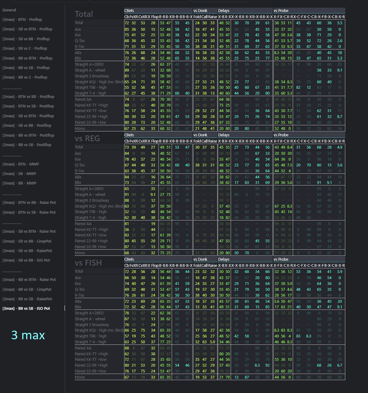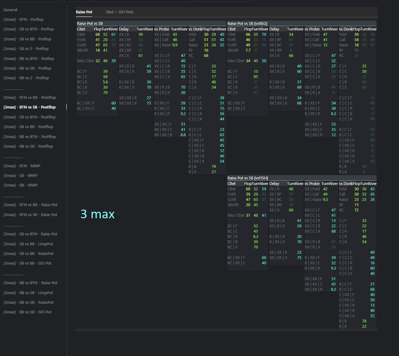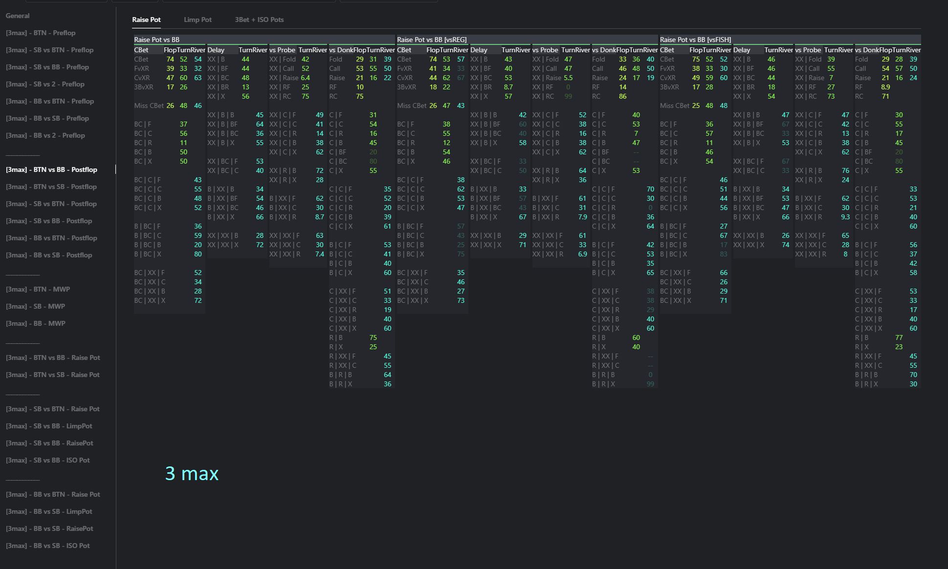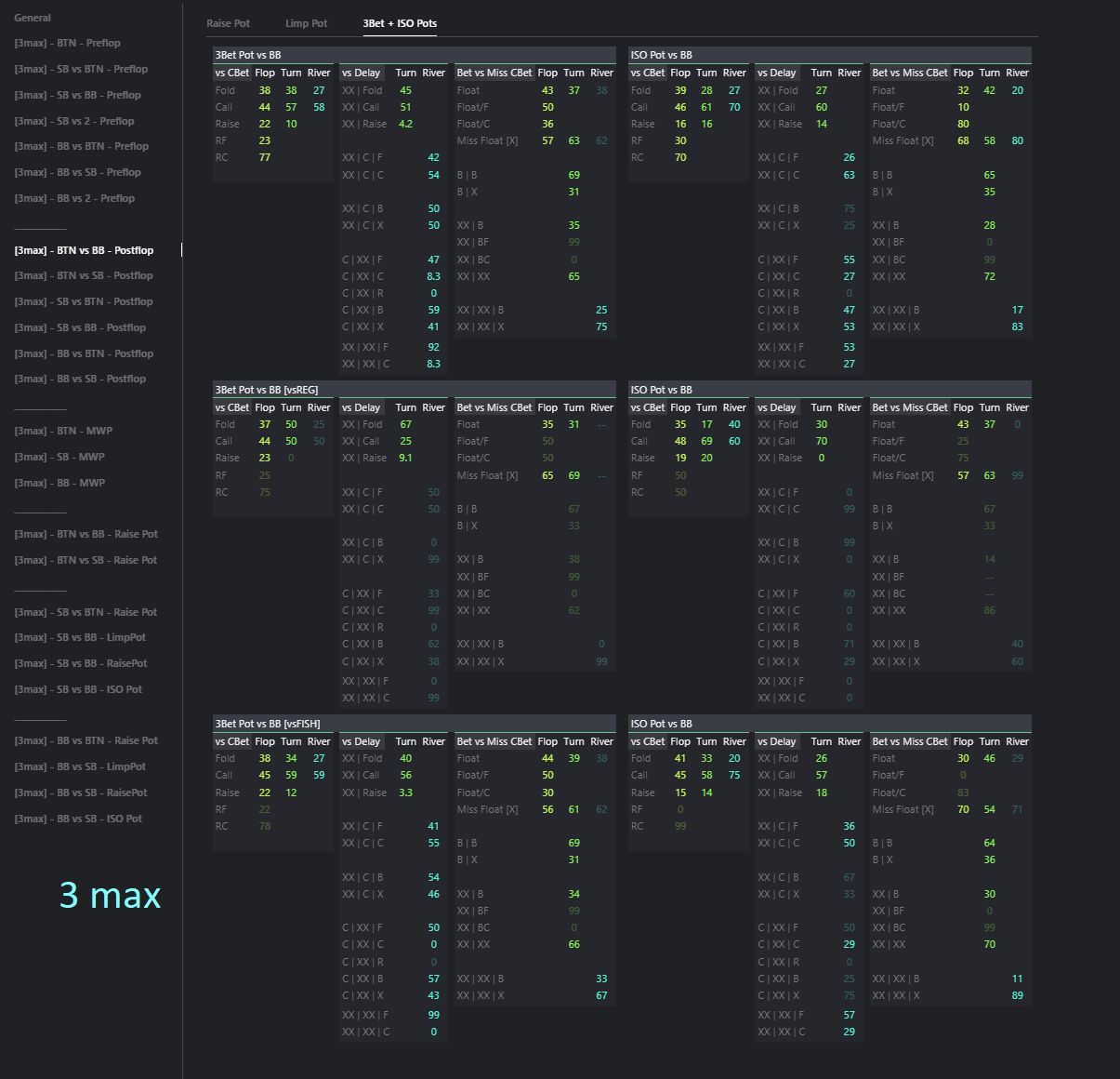В 3-max каждое позиционное противостояние требует своего подхода. Игра SB против BB включает статистику по Limp Pot, Raise Pot и ISO Pot, причем для изо-банков без разделения по стекам. Аналогично структурирована статистика для BB против SB.