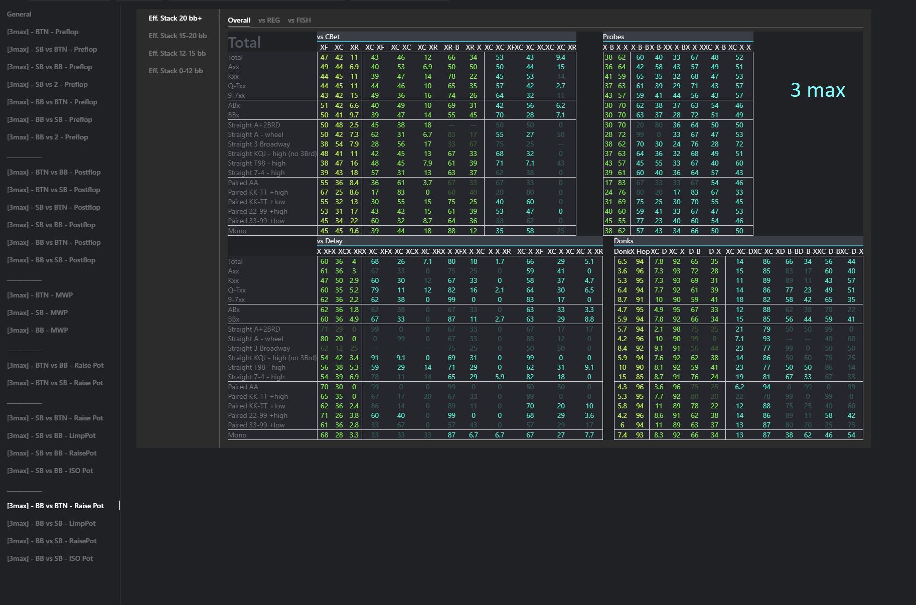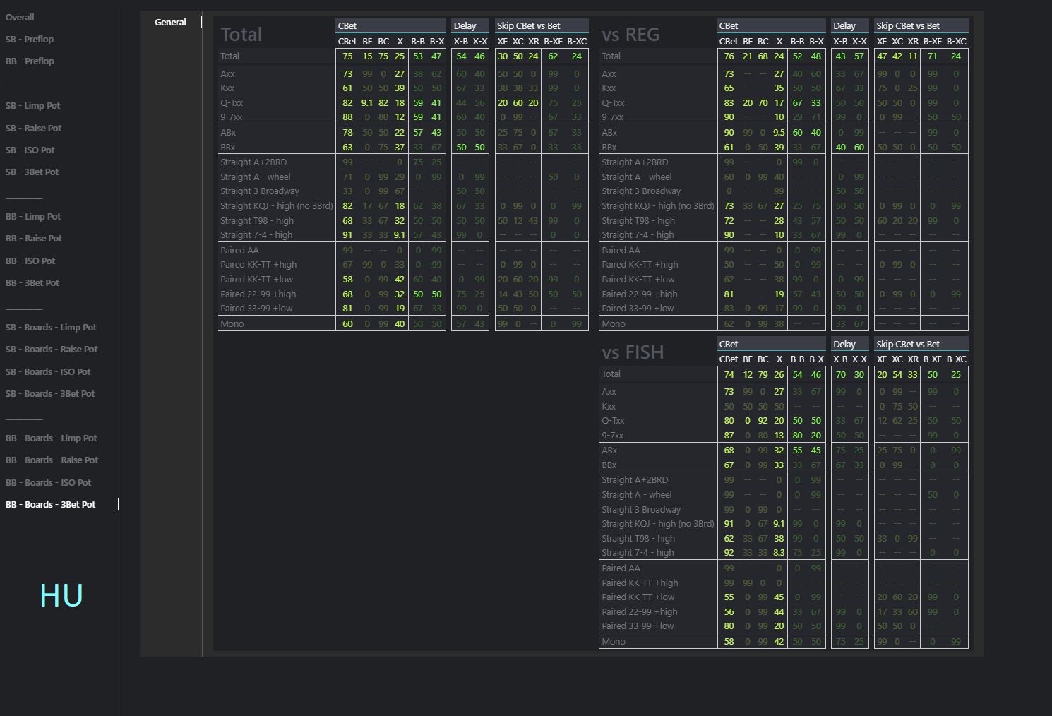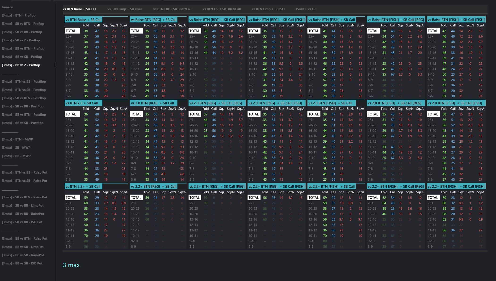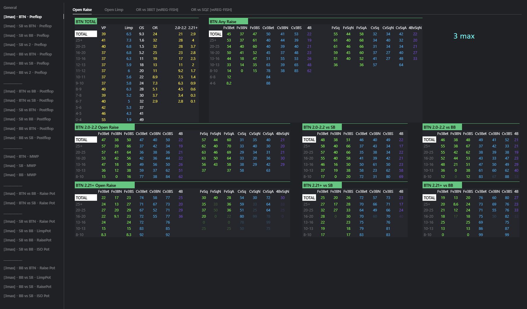 В 3-max каждое позиционное противостояние требует своего подхода. Игра SB против BB включает статистику по Limp Pot, Raise Pot и ISO Pot, причем для изо-банков без разделения по стекам. Аналогично структурирована статистика для BB против SB.