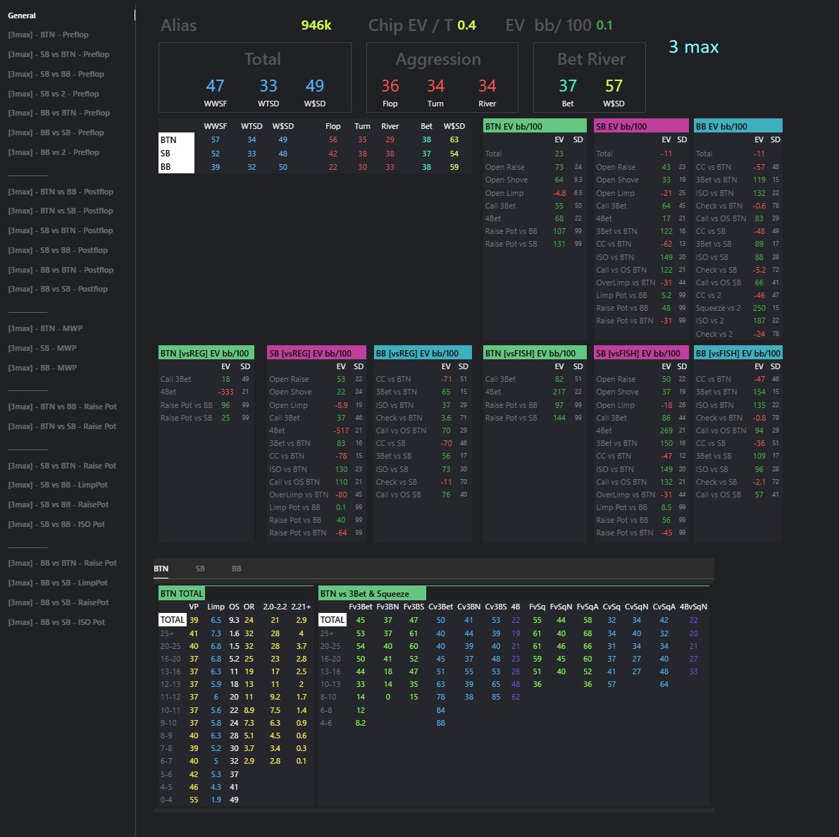 Попап для 3-max содержит 65000 статов, из которых 14000 посвящены префлопу, а 51000 — постфлопу. Такая детализация позволяет анализировать игру соперников с невероятной точностью.