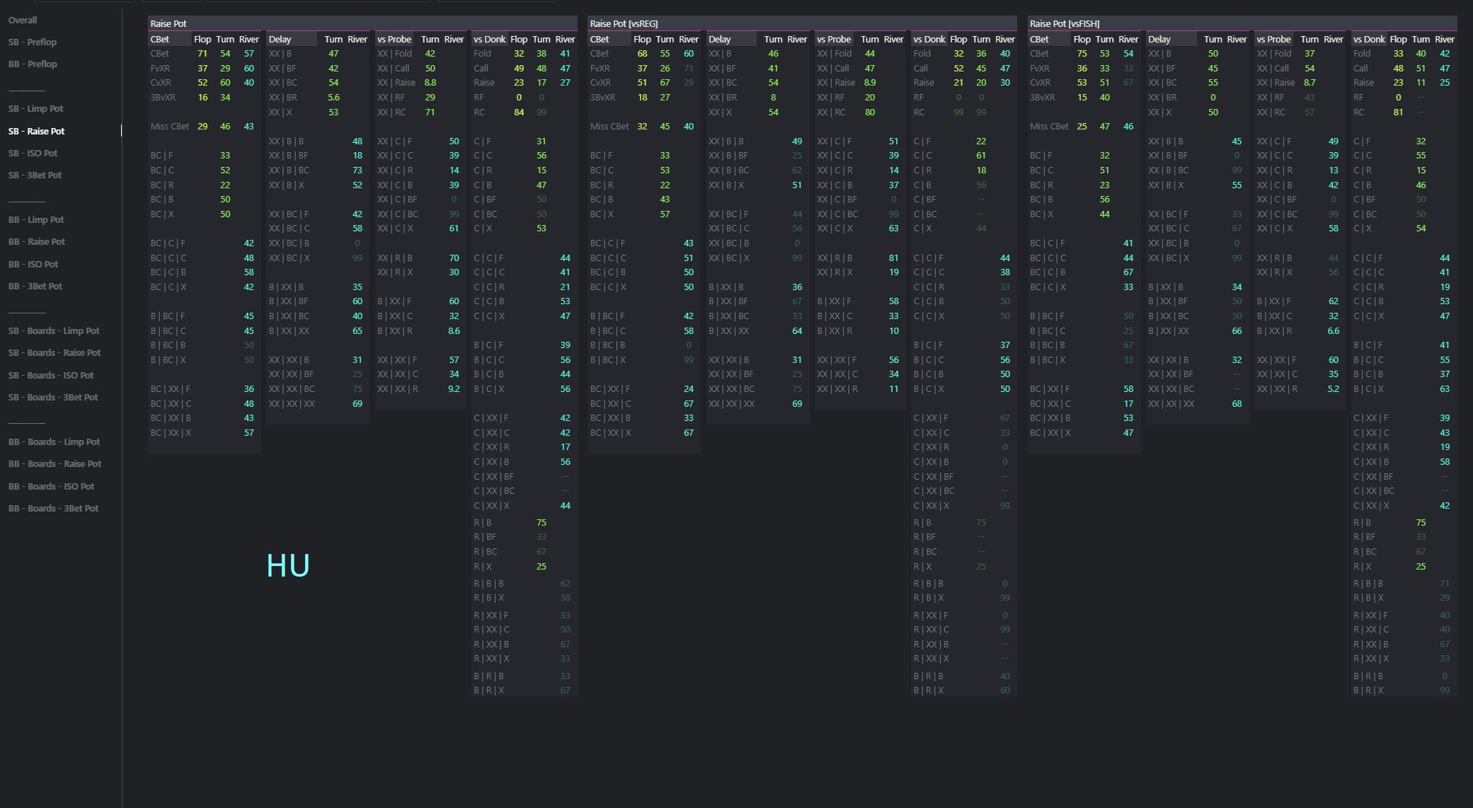 В хедз-ап формате доступна статистика по четырем основным типам банков: Limp Pot, Raise Pot, ISO Pot и 3Bet Pot. Для 3-бет банков разделение по размерам стеков не применяется, так как игра в них имеет более универсальный характер.
