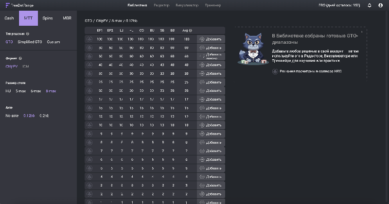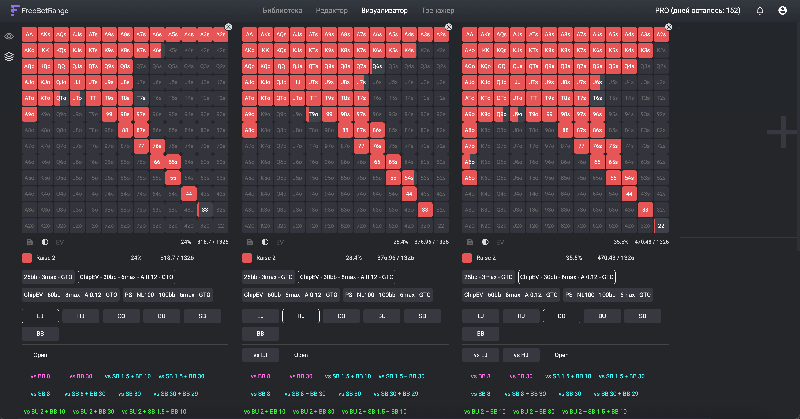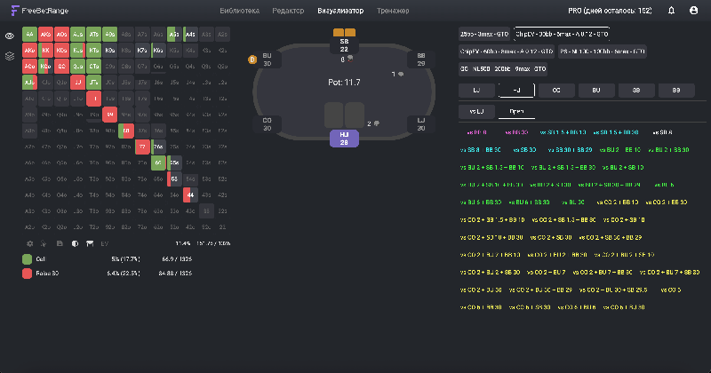FreeBetRange – специальный покерный софт для работы с префлоп-диапазонами. В нем можно создавать свои чарты для различных ситуаций на префлопе, использовать готовую GTO библиотеку или импортировать ренжи из других программ.
