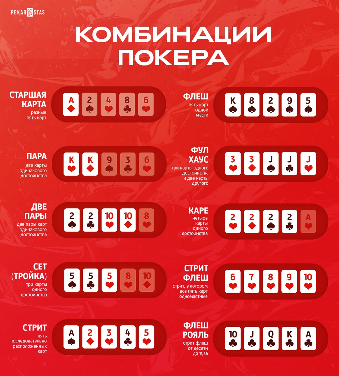 Давайте рассмотрим все комбинации покера, которые мы расположили от слабых комбинаций до самых сильных. Также ниже мы расположили подробные примеры, которые помогут вам разобраться с типовыми ситуациями и вопросами, которые возникают при сравнении покерных комбинаций.